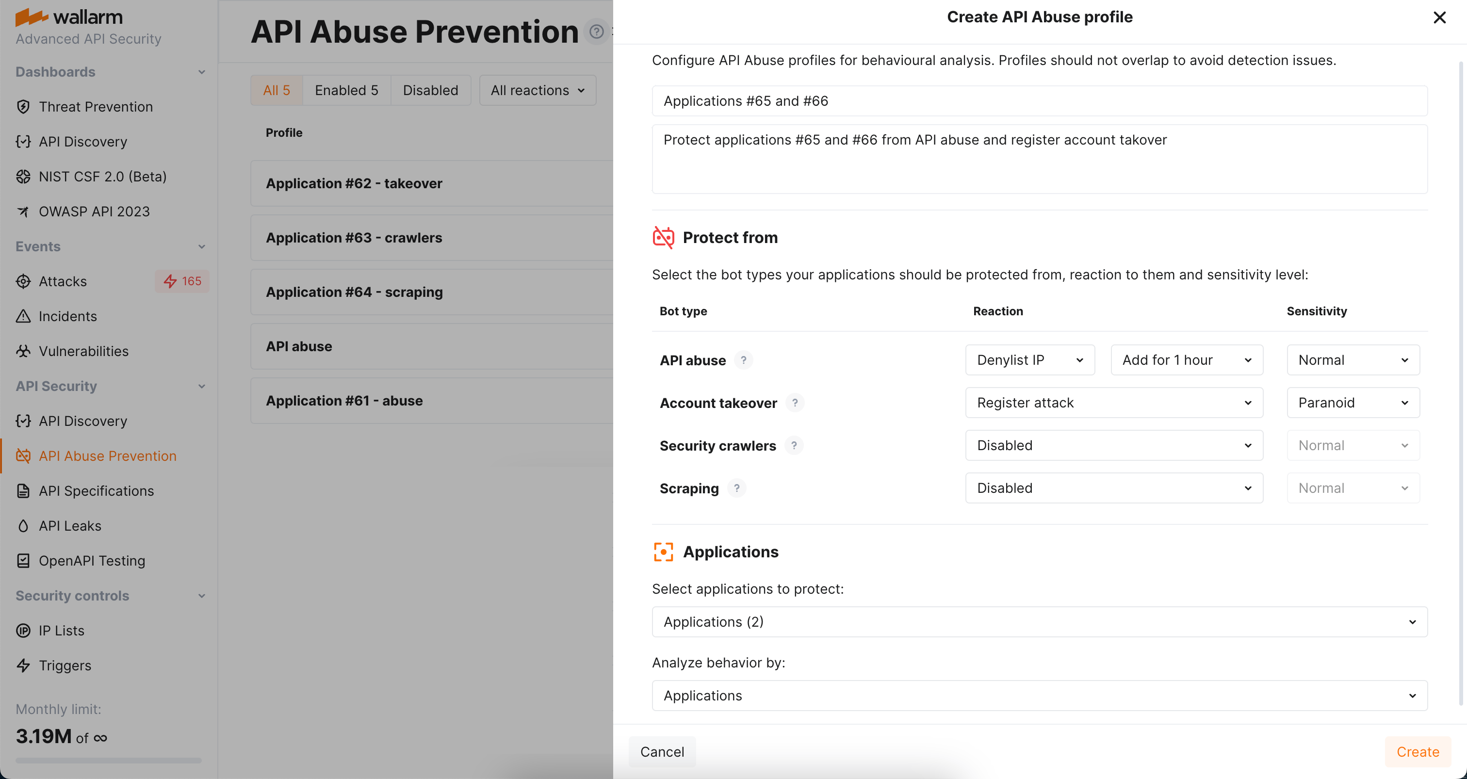 API abuse profiles are used to configure how Wallarm's API Abuse Prevention detects and mitigates malicious bots. You can create different profiles for different applications. Each application can have only one associated profile.
